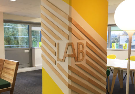 Mise en couleur et lettrages peints à la main sur les murs du Lab Heineken France conçu par l’agence Épatant