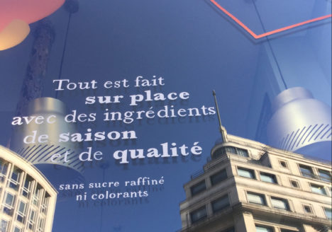 Vitrine peinte à la main, lettrages et motifs, pour Tartelettes tarterie et salon de thé Paris 2e