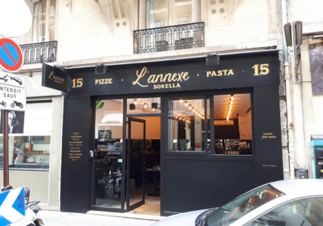 Logo dessiné à la main et devanture peinte à L’Annexe Sorella, Paris 17e
