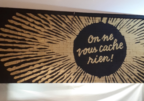 Décoration murale, lettrage et décor en doré sur briques noires, restaurant Paillettes, Paris 8e
